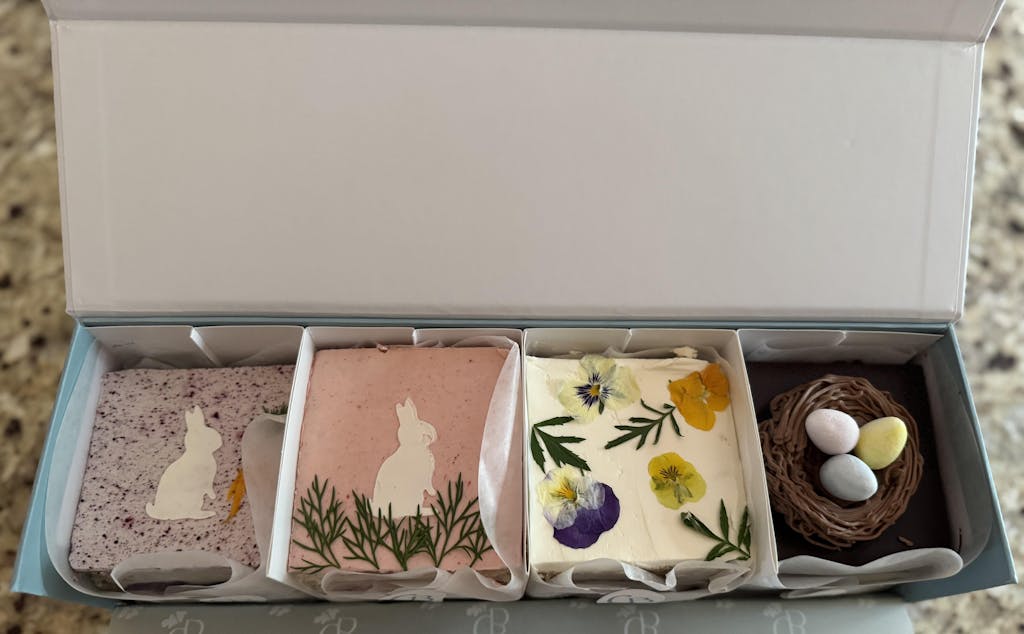 Perfect for Easter celebrations, spring gatherings and thoughtful gifting, The Bunny Box is a treat for all ages. This limited-edition tasting set features our three April seasonal flavors, plus our top-selling Rainbow Carrot cake, each adorned in a unique spring design using stenciled buttercream, pressed florals and more.